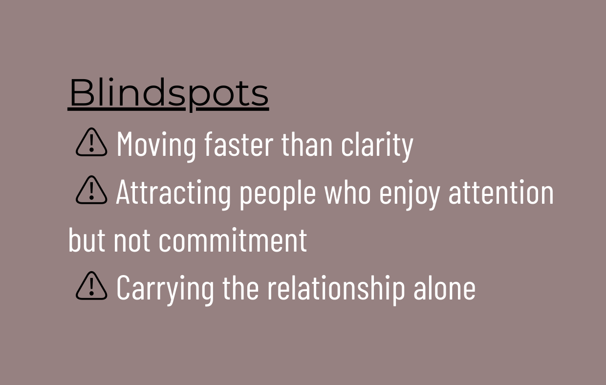 Where The Initiator can struggle is with effort without discernment. You may move faster than clarity, invest in people who enjoy attention but lack intention, or find yourself carrying the energy of the connection alone. Over time, this can feel frustrating—like you’re always doing the work but not seeing the return.