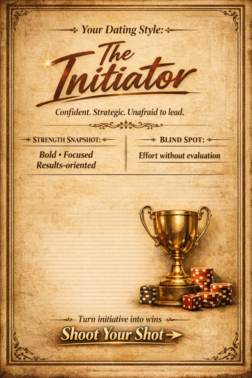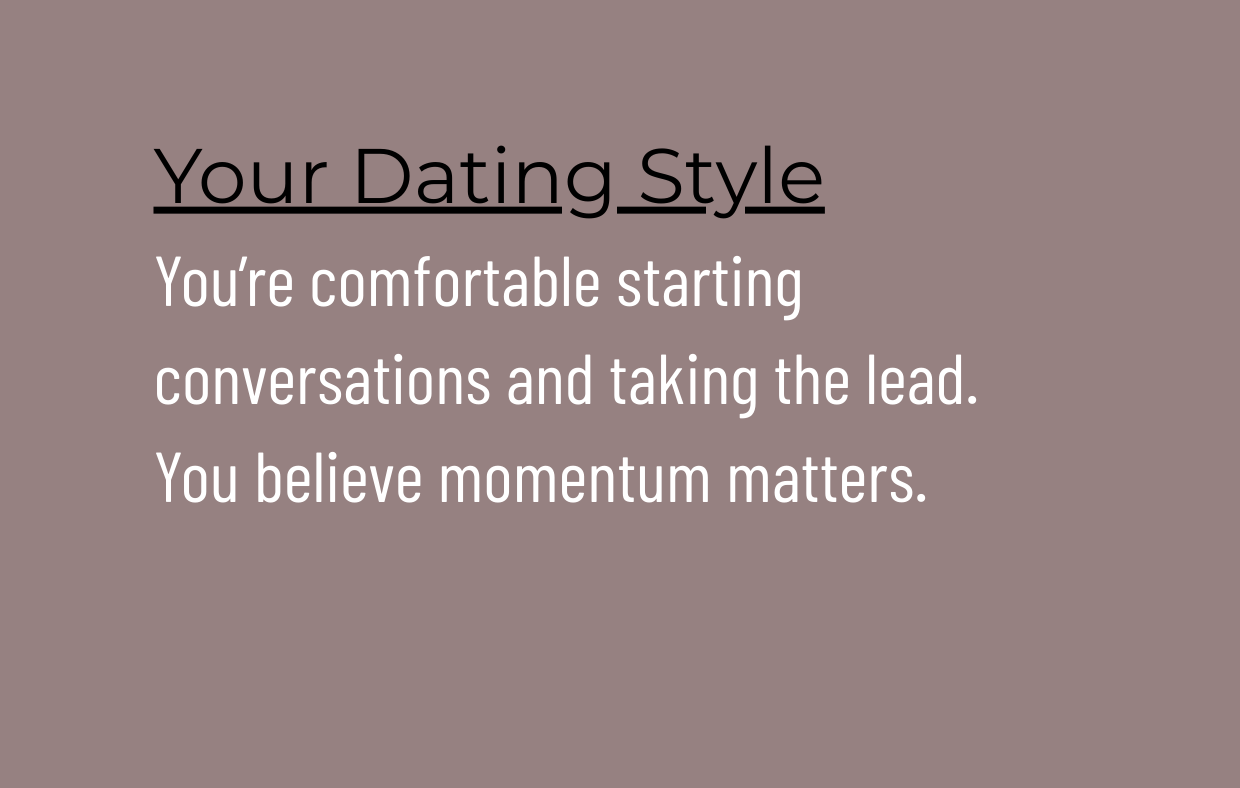 As The Initiator, you are confident, bold, and willing to take action. You don’t believe in waiting around for life to happen—you move. You’re comfortable starting conversations, expressing interest, and creating momentum. Many people admire your courage, even if they don’t always say it out loud.